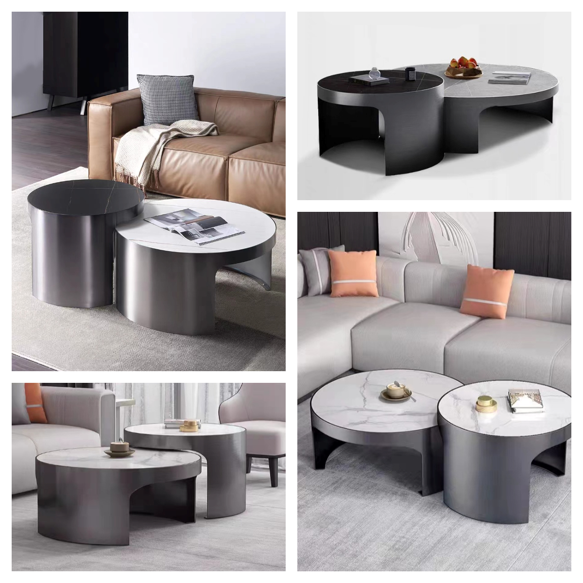 1. Ceramic Marble Tabletop: The coffee table set features a round tabletop made of high-quality ceramic marble. The marble surface showcases the natural veining and patterns, adding a touch of elegance and sophistication to the design. The tabletop can have a polished finish, creating a smooth and luxurious feel.